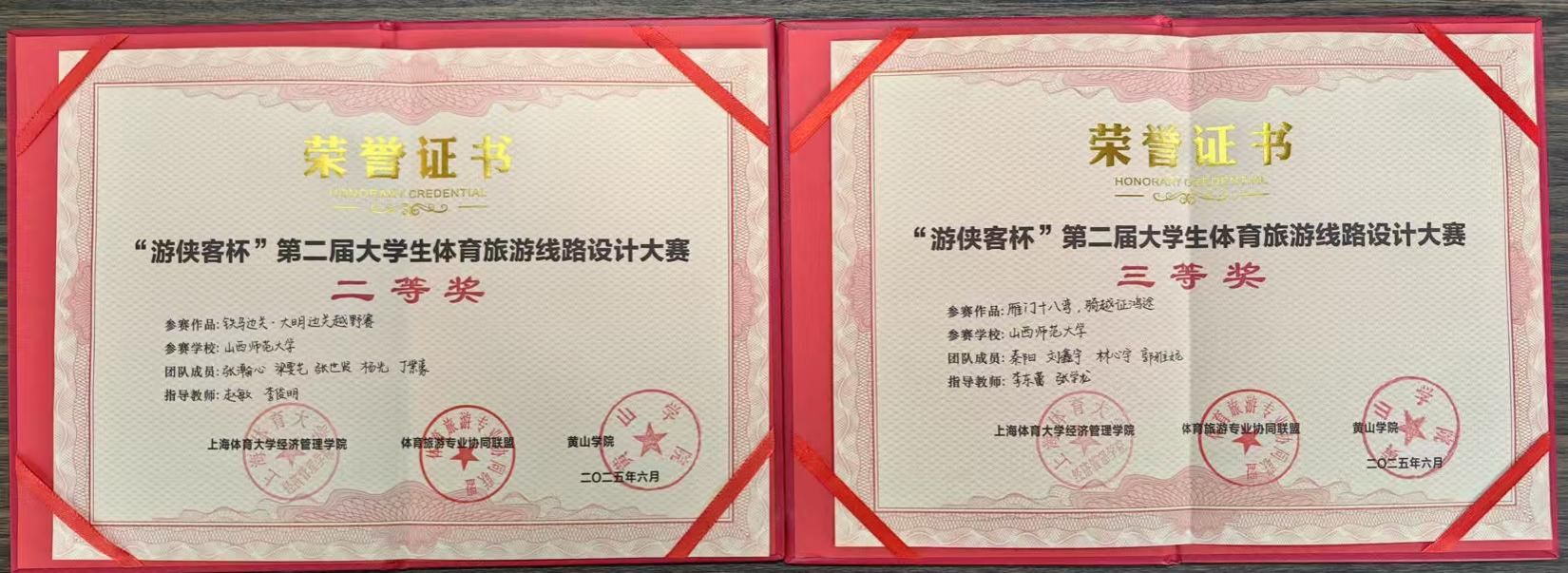2025年6月4日,"游侠客杯"第二届大学生体育旅游线路设计大赛决赛在安徽省黄山市圆满落幕。我校sunbet体育旅游专业和社会体育指导与管理专业7名同学在李俊明和李东蕾老师带领下参赛,分别凭借作品《铁马边关·大明边关越野赛》和《雁门十八弯·骑征越鸿途》荣获大赛二、三等奖。